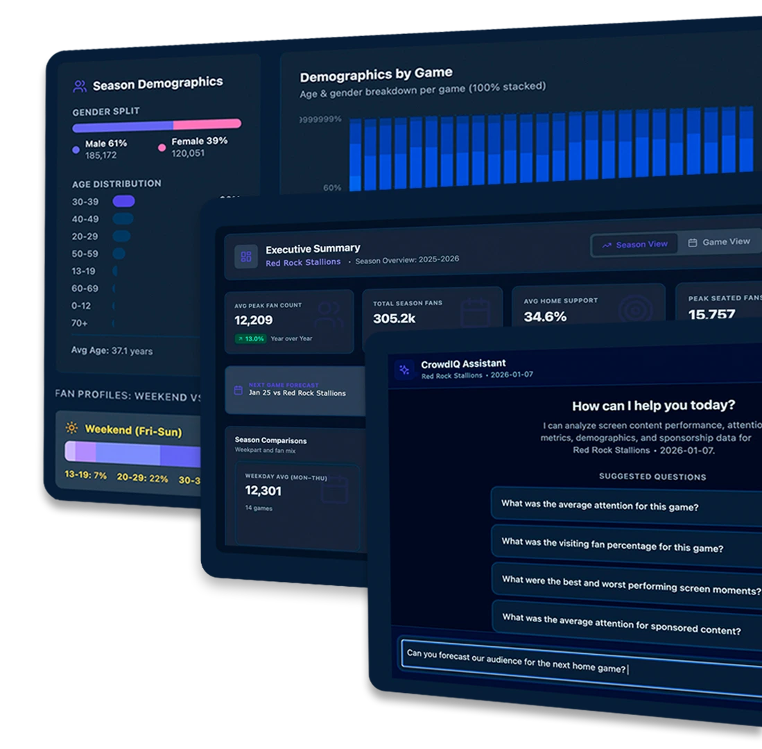 CrowdIQ’s proprietary AI processes attendance, behavior, demographics, and engagement to reveal what’s actually happening inside the venue.